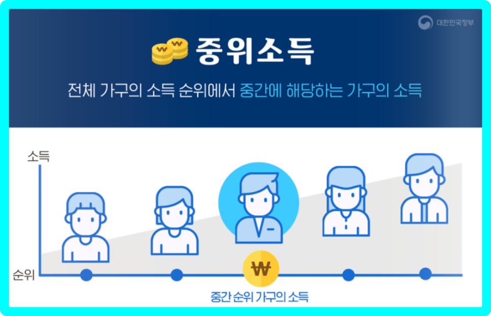 중위소득은 소득 순서로 줄을 세웠을 때 정중앙에 위치한 가구의 소득을 의미합니다. 이는 각종 복지 정책의 기준이 되는 중요한 지표로 사용됩니다.