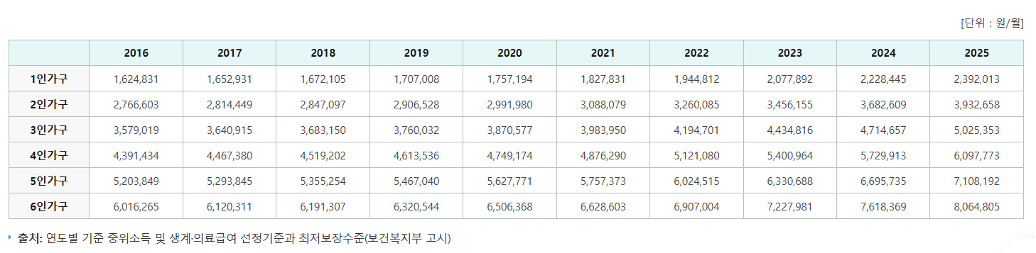 기준 중위소득은 가구원 수에 따라 다르게 적용됩니다. 정부는 1인가구부터 6인가구 이상까지 세분화된 중위소득을 발표합니다.